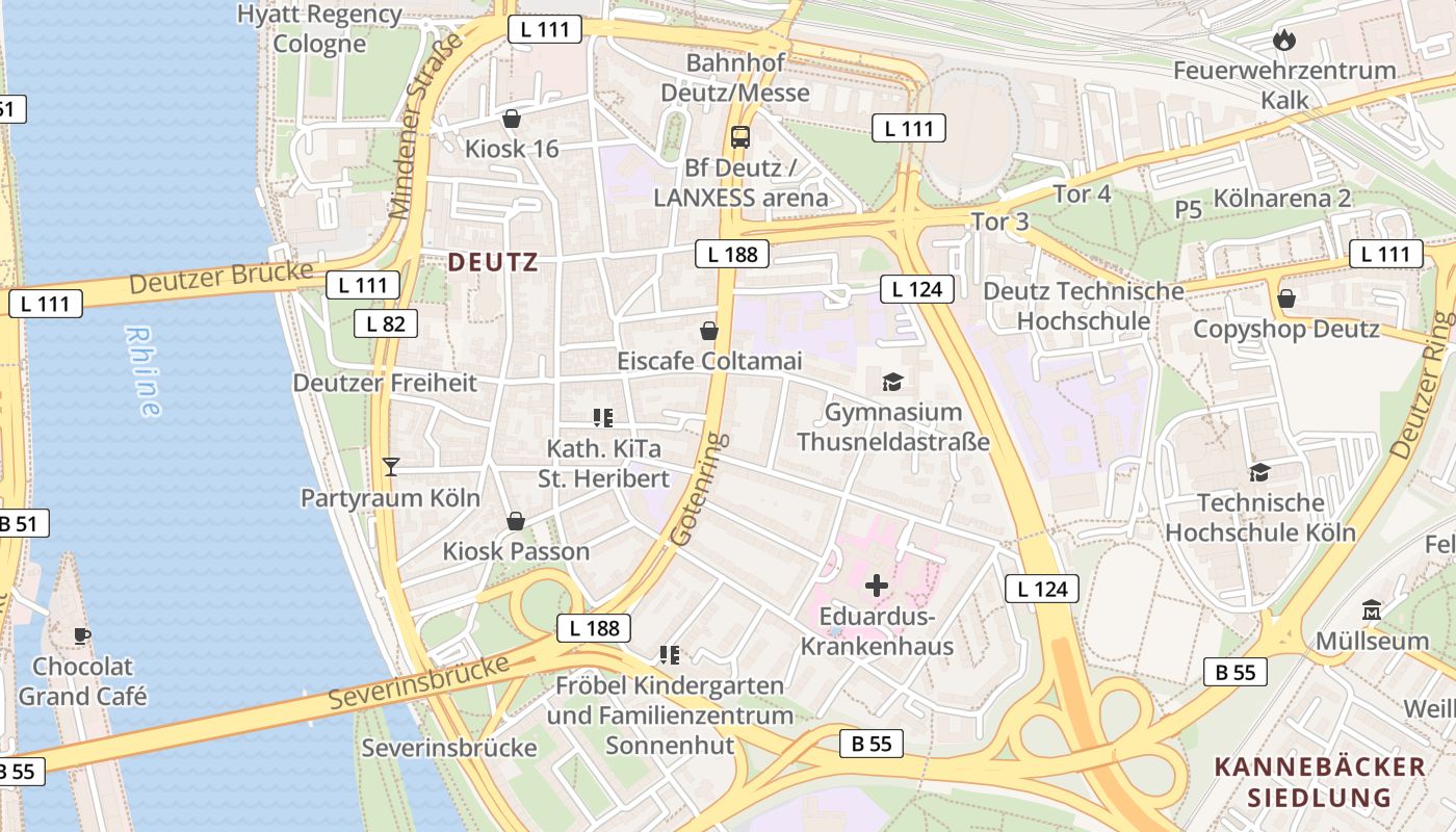 Dieses Apartment ist in etwa 25 Gehminuten Entfernung vom Museum für Angewandte Kunst sowie in rund 25 Gehminuten Entfernung von der Hohenzollernbrücke gelegen. Der Kölner Dom ist ungefähr 2 Kilometer von diesem 60 m^2 großen Apartment entfernt.
